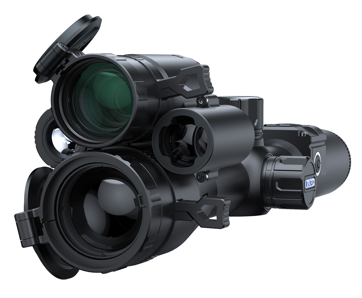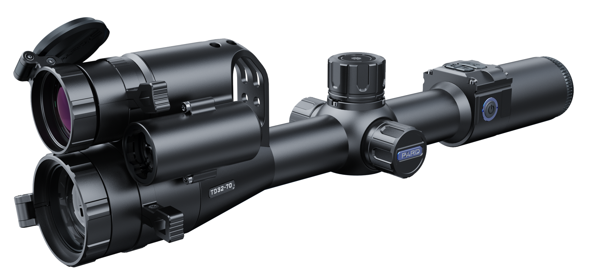 The TD32-70 Multispectral Rifle Scope revolutionizes hunting with four observation channels, thermal image and night vision/day time image. You can use each image channels seperately or combine a thermal main image with a night vision/daytime PIP or switch the thermal image into PIP as you need. By doing this, you can enjoy the benefits of thermal identification and night vision target recognition.The scope features PIP mode enables the simultaneous display of thermal imaging and night vision on the same screen, allowing for enhanced observation, identification and precise shooting; ballistic calculation function, hunters can quickly and accurately shoot the target; convenient knob control for instant switching the position between thermal imaging and night vision display on the same screen; Reticle color red/white/yellow/green; Laser Range Finder with an impressive range of 1200yds delivers real-time and accurate distance measurements; thermal imaging detector with a resolution of 384-288, 12m pixel pitch and NETD25mK, combined with a high-performance CMOS sensor and multi-channel display, the TD32-70 provides a versatile hunting experience in various scenarios. Includes two PARD 30mm standard mounts.